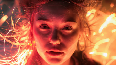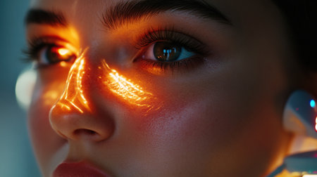 Macro portrait of female face with glowing orange light patterns symbolizing digital interface, data processing, and biometric scanning