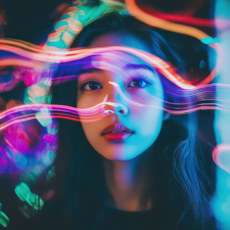 A young woman stands captivated by vibrant light trails in an urban setting at night creating an ethereal atmosphere around her.