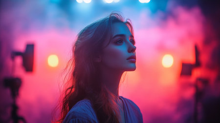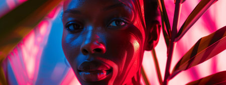 A close-up portrait of a young woman in dramatic, colorful lighting, highlighting her facial features and symbolizing individuality and modern style.