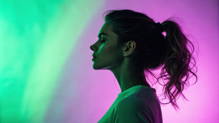An ethereal image of a womans side profile her silhouette highlighted by a cascade of green and purple neon hues. The backlighting enhances her features giving a surreal and.