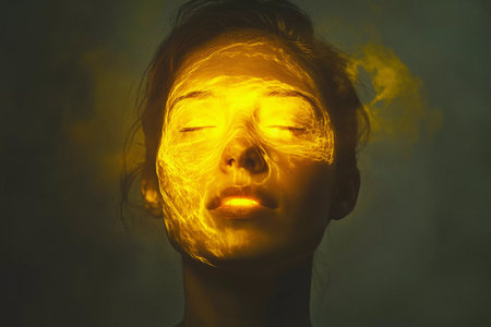 A tranquil figure with closed eyes is bathed in a vibrant yellow glow, capturing a moment of peace. The light dances across the face, creating an enchanting and ethereal atmosphere.