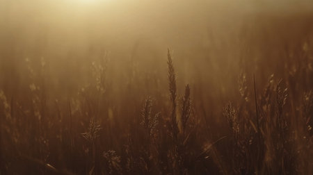 A soft golden haze blankets a wheat field at sunrise, creating an ethereal atmosphere filled with the beauty of nature and tranquility.