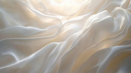 This image features a close-up of soft white silk fabric, beautifully illuminated by gentle light, revealing elegant folds and smooth textures, perfect for fashion and home decor.
