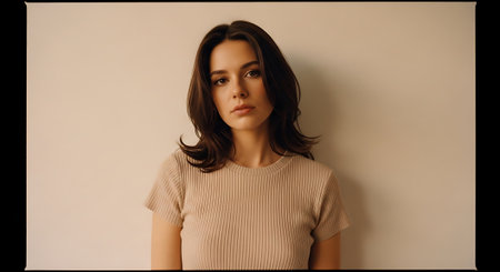 A young woman with long brown hair standing against a plain wall