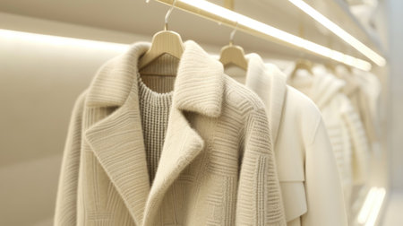 A sophisticated display of a white-beige coat and sweater on hangers in a high-end fashion store. These classic pieces showcase timeless elegance in women's fashion