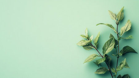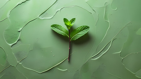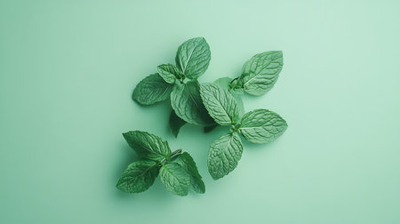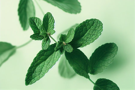 A fresh sprig of mint lies on a delicate green background. Generated by AI.