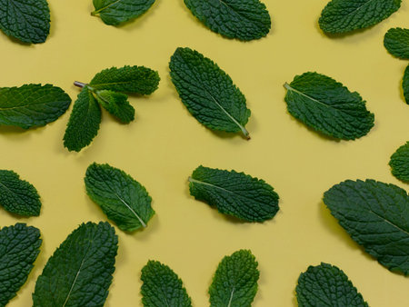 Bright and fresh mint leaves forming a pattern on a soft green background, copy space.