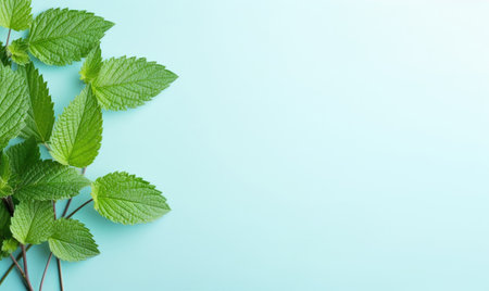 Fresh meadow mint leaves twig on a pastel blue background with empty copyspace. Botanical herb concept. Flat lay. Created with generative AI tools