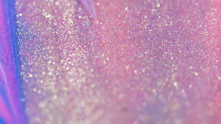 Shiny paint drip. Glitter fluid texture. Defocused pink purple color sparkle particles wet glow ink liquid gloss spill wave abstract art background with bokeh lights.
