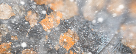 First snow falling gently on Pak wan tree leaves, a few snowflakes drifting slowly and settling on the leaves; fresh air, natural.