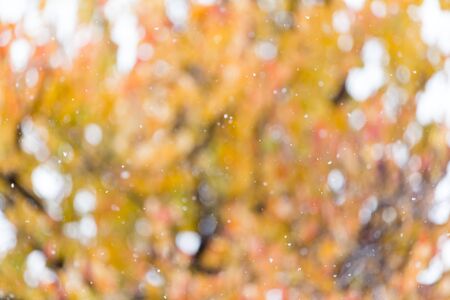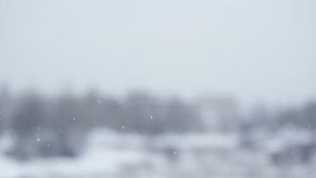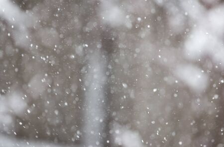 Winter background with fallen defocused snowflakes with tree silhouette in the background - defocused snowflake