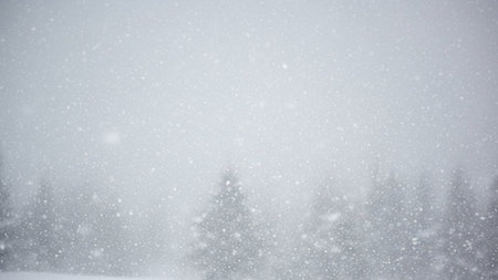 Winter, blur spruce trees, bokeh, falling snow defocused background