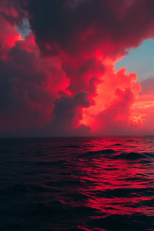 Beautiful sunset over the sea. Dramatic sky with red clouds.
