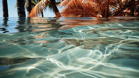 The dappled shadow of lush tropical leaves dances delicately on the crystal clear surface of the tranquil tropical beach