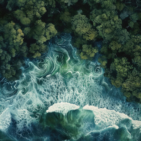 This image showcases a dynamic view of ocean waves, with swirling water patterns and rich textural details. The composition displays various shades of teal and white, suggesting a turbulent environment. Suitable for a range of uses, this photograph could be employed in various commercial and editorial contexts.