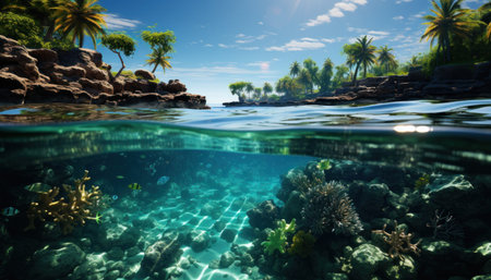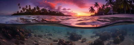 panorama of a beach resort and underwater world at the same time, dividing the image into upper and lower parts by a wave