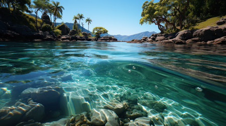This photo captures a body of water filled with a multitude of bubbles, creating a dynamic and visually interesting scene, An abstraction of a coral reef under clear turquoise waters, AI Generated