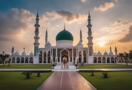 Stunning mosque stands tall against a vibrant sunset, with crescent moon above and cityscape in the background, highlighting architectural elegance and cultural richness
