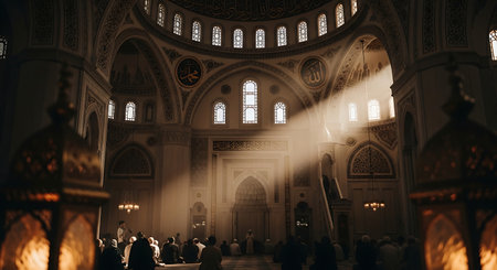 A breathtaking view inside a historic mosque, where a powerful beam of sunlight cuts through the dim interior, highlighting the intricate dome and arches, and creating a mystical atmosphere as it illuminates floating dust particles.