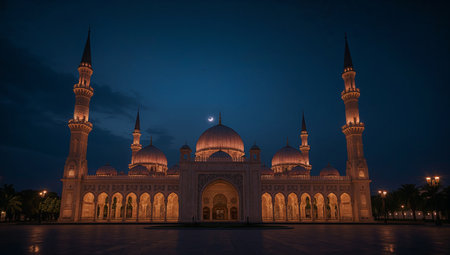 Generative AI Image of Luxurious Islamic Mosque Building with Crescent Moon and Trees at Night