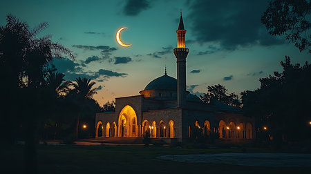 A symbol of faith and tranquility. This image captures the beauty of an Islamic place of worship during the golden hour, featuring a clear crescent moon, representing hope and new beginnings.
