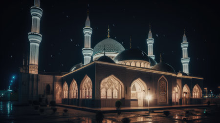 The Beautiful Mosque Glows at Night Against the Dark Sky extreme closeup. Generaive AI