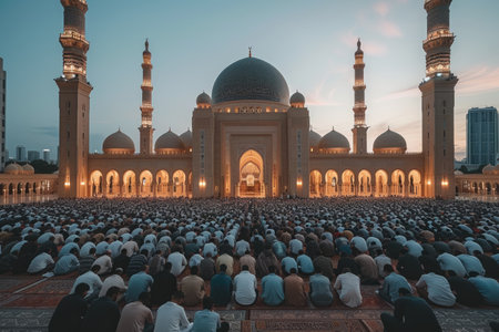 Serene Prayer Time in Majestic Mosque Men in traditional attire engage in a tranquil prayer.