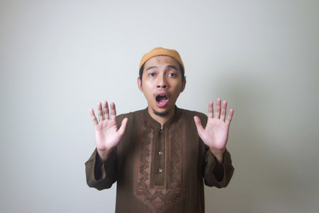 Moslem Asian man surprised expression looking to camera when Ramadan celebration. The photo is suitable to use for Ramadhan poster and Muslim content media.