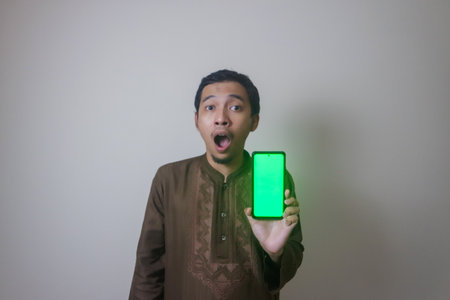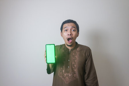 Happy Young Asian Muslim man showing blank green phone screen and pointing phone screen