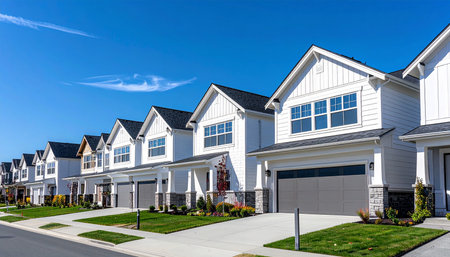A suburban street showcases a development of white houses featuring garages, stone accents, and well-kept green lawns under a bright blue sky.