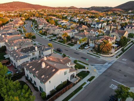 Aerial view of residential modern subdivision luxury house neighborhood. South California, USA