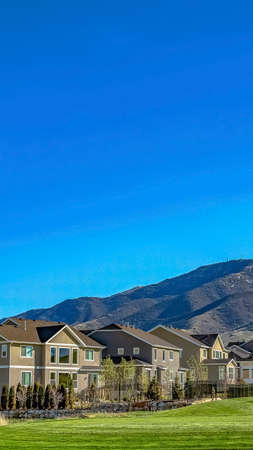 Vertical Charming homes and towering mountain under clear blue on a sunny day