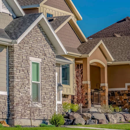 Vertical frame Facade of townhouses illuminated by sunlight with vibrant blue sky background. The homes have sliding windows and combination of brick, concrete, and wood wall.