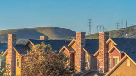 Panorama frame Homes with gray gable roofs and stone brick chimneys against mountain and sky. Sunny day views of beautiful houses with electricity towers on a hill in the background.