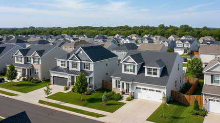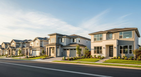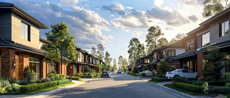A picturesque suburban neighborhood showcases modern homes under a clear blue sky, featuring manicured lawns and well-maintained driveways, inviting a serene lifestyle.