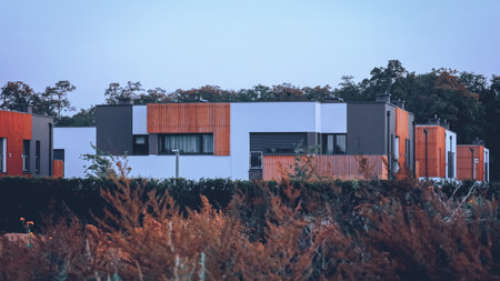 Modern minimalist suburban housing estate with muted tones and clean lines