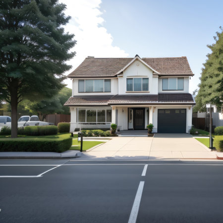 Generative AI Image Simple Cozy Modern Home House with Lush Green Tree in Suburbia at Bright Day