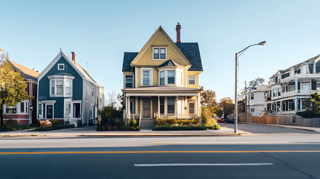 Suburban street with row of colorful houses under blue sky