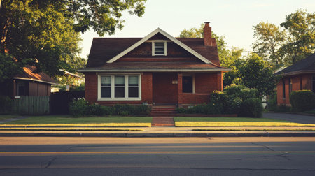 view of quiet residential neighborhood at dusk, with warm evening light and clear sky visible, created with generative ai