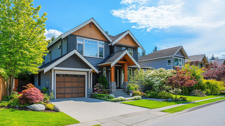Beautiful suburban house with well maintained lawn, white picket fence, and colorful landscaping. clear blue sky adds to inviting atmosphere of this peaceful neighborhood