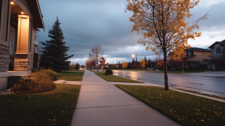 A tranquil evening scene featuring a sidewalk bordered by colorful autumn trees and a dramatic cloudy sky. Ideal for reflecting on peaceful residential life.
