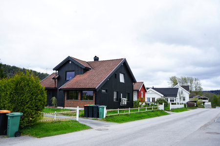 Modern Nordic black wooden house with brown tiled roof and brick foundation, located in a quiet residential area in Norway.