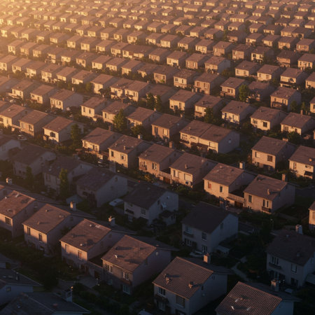 Aerial view of vibrant, multicolored rooftops in a suburban neighborhood, highlighting the unique styles and layouts of the houses as the sun rises in the background.