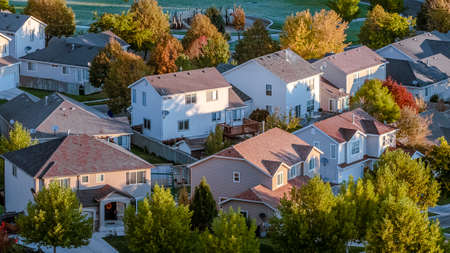 Aerial view of residential area at sunset. Residential area in evening light.