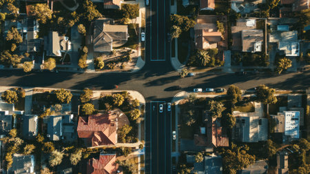 An overhead view reveals a residential area with organized streets, buildings, and green trees. The composition highlights the geometric arrangement, with a combination of buildings. The style showcases natural colors and lighting, suggesting a daytime scene. Suitable for a wide variety of commercial and editorial uses, it portrays organized urban planning.