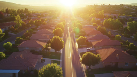 An inviting sunset casts a warm glow over a quiet suburban street. Rows of houses line the road, framed by autumnal trees. The image showcases a tranquil environment, bathed in the soft light of dusk. Suitable for depicting residential settings or illustrating seasonal transitions for various commercial purposes.