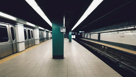 Empty Subway Station Perspective with Bright Yellow Safety Lines and Fluorescent Lighting