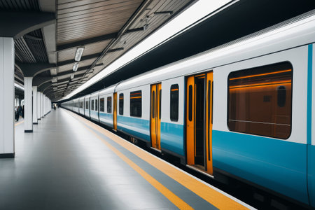 Modern subway train with blank ad spaces stands at a platform. - ai