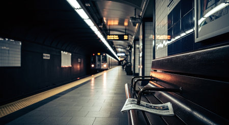 A quiet subway station with a bench in the foreground, a newspaper lying on the bench, and a train approaching in the background