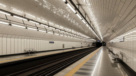 A stunning image capturing the essence of an illuminated subway tunnel, showcasing tracks leading to unknown destinations in a modern urban landscape.